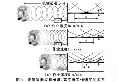 銑刨面縱向紋理的間距深度則與工作速度、刀尖線速度有關(guān)。圖4為銑刨縱向紋理長(zhǎng)度、高度與工作速度的關(guān)系,可見(jiàn)銑刨作業(yè)速度越快,銑刨的紋理長(zhǎng)度越長(zhǎng)(如圖4所示,紋理長(zhǎng)度b>d>f)、紋理高度越高(如圖4所示,紋理高度c>e>g),則表面越粗糙;反之,作業(yè)速度越慢,紋理越細(xì)密。而刀尖線速度則與銑刨轉(zhuǎn)子直徑和轉(zhuǎn)速有關(guān),銑刨轉(zhuǎn)子直徑越大,轉(zhuǎn)速越高,銑刨紋理就越密,這兩個(gè)參數(shù)與銑刨機(jī)廠家設(shè)計(jì)有關(guān)。