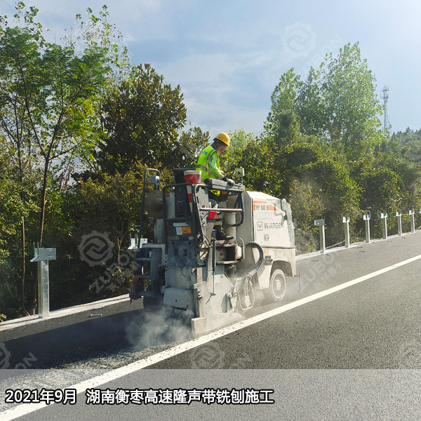 銑刨式隆聲帶在警示效果、施工簡單高效,成本低廉等方面有明顯優(yōu)越性,杭瑞高速常德段和懷化段就是采用尺寸為:寬*長*深=400*180*13mm、間距300mm的銑刨式隆聲帶。